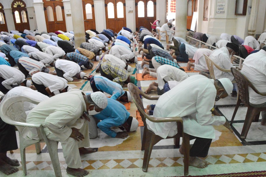 أشخاص يرتدون أقنعة وجه يؤدون صلاة الجمعة خلال شهر رمضان في بنغالور في الهند يوم 16 أبريل 2021. (شينخوا)