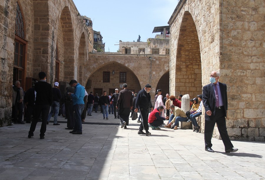 أناس يزورون مسجد المنصوري الكبير القديم لأداء صلاة الجمعة الأولى خلال شهر رمضان المبارك في طرابلس في لبنان يوم 16 أبريل 2021. (شينخوا)