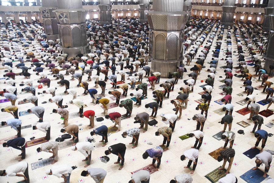مسلمون يؤدون صلاة ظهر الجمعة الأولى مع الالتزام بالتباعد الاجتماعي خلال شهر رمضان المبارك في مسجد الاستقلال في جاكرتا في إندونيسيا يوم 16 إبريل 2021. (شينخوا)