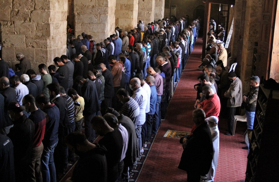 أناس يؤدون صلاة الجمعة الأولى خلال شهر رمضان المبارك في مسجد المنصوري الكبير القديم في طرابلس في لبنان يوم 16 أبريل 2021. (شينخوا)
