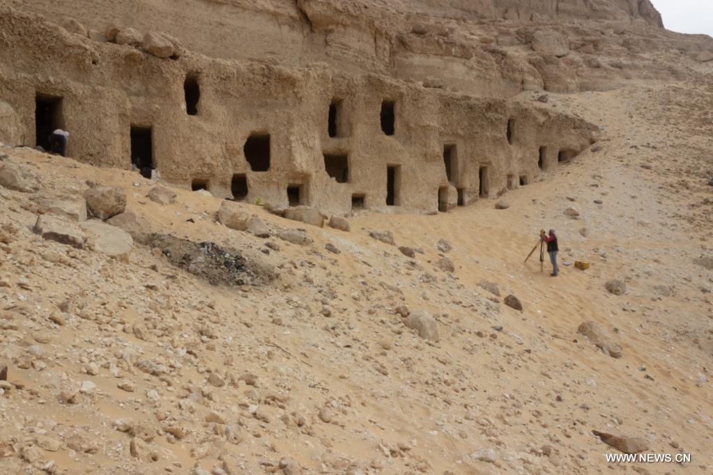 في الصورة الملتقطة يوم 11 مايو 2021، موقع أثري يحوي مقابر صخرية بمنطقة جبلية بمحافظة سوهاج بمصر. قالت وزارة الآثار والسياحة المصرية اليوم (الثلاثاء) إن بعثة أثرية مصرية اكتشفت 250 مقبرة صخرية ترجع إلى فترات مختلفة تتراوح ما بين نهاية الدولة القديمة حتى نهاية العصر البطلمي.