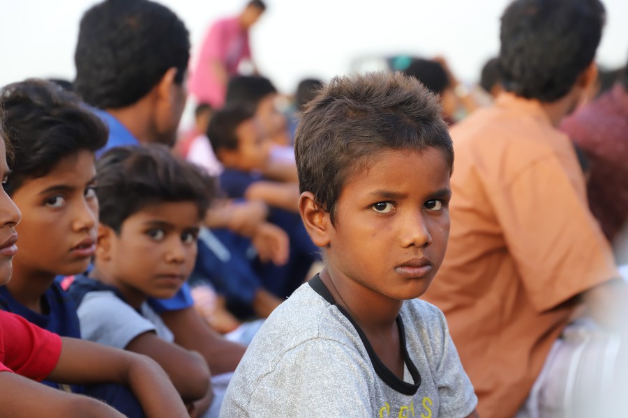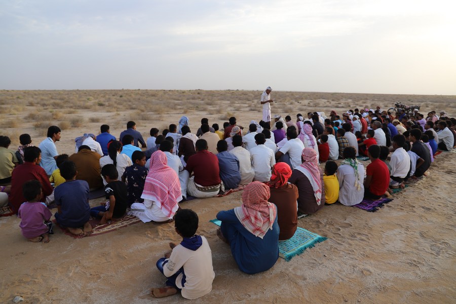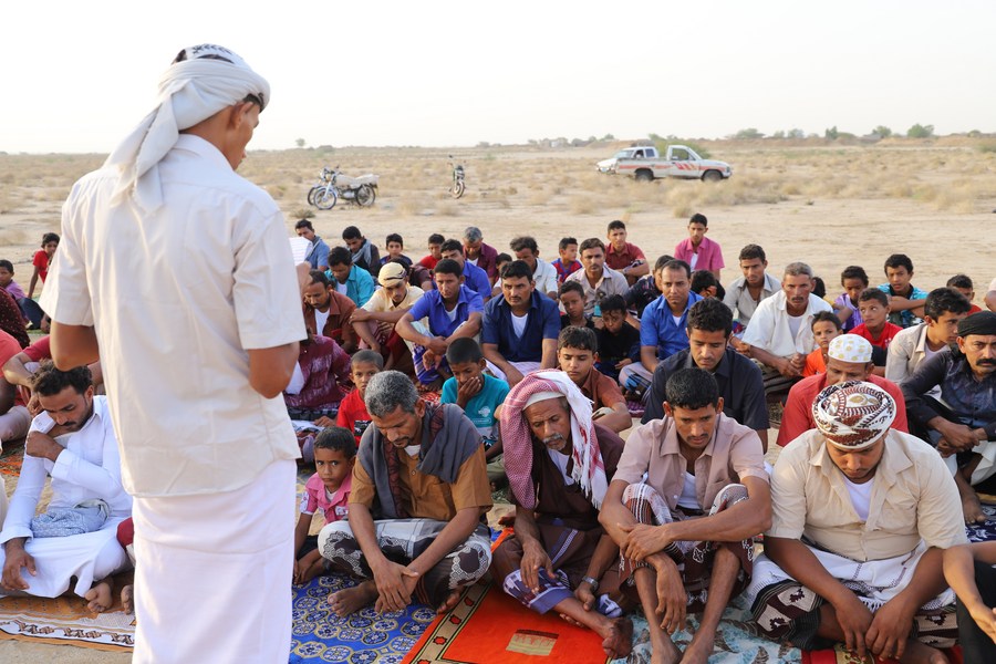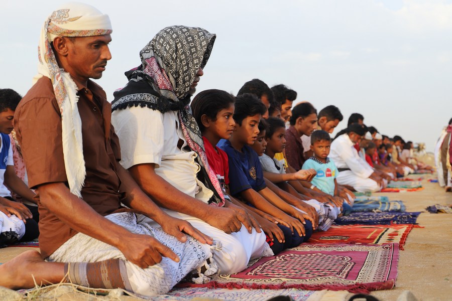 نازحون يمنيون يؤدون صلاة عيد الفطر في الصحراء بالقرب من مخيمهم بمحافظة حجة شمالي اليمن في 13 مايو 2021. (شينخوا)■