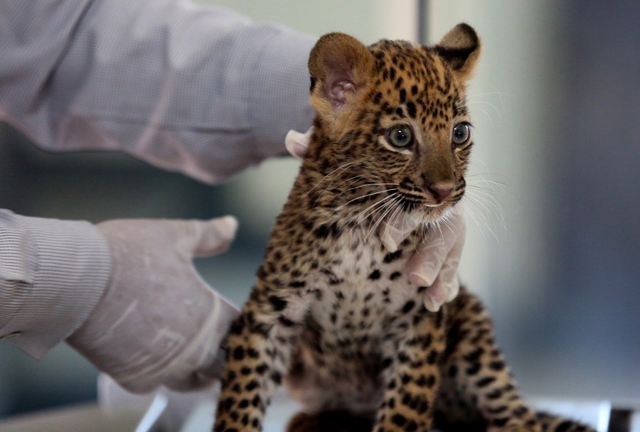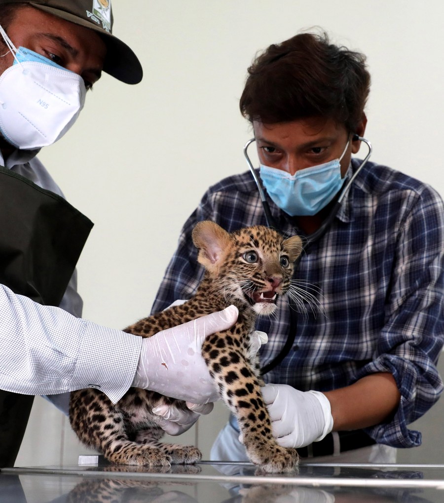 طبيب يفحص شبل النمر في حديقة فان فيهار الوطنية في بوبال حاضرة ولاية ماديا براديش الهندية، في 30 مايو 2021. (شينخوا)