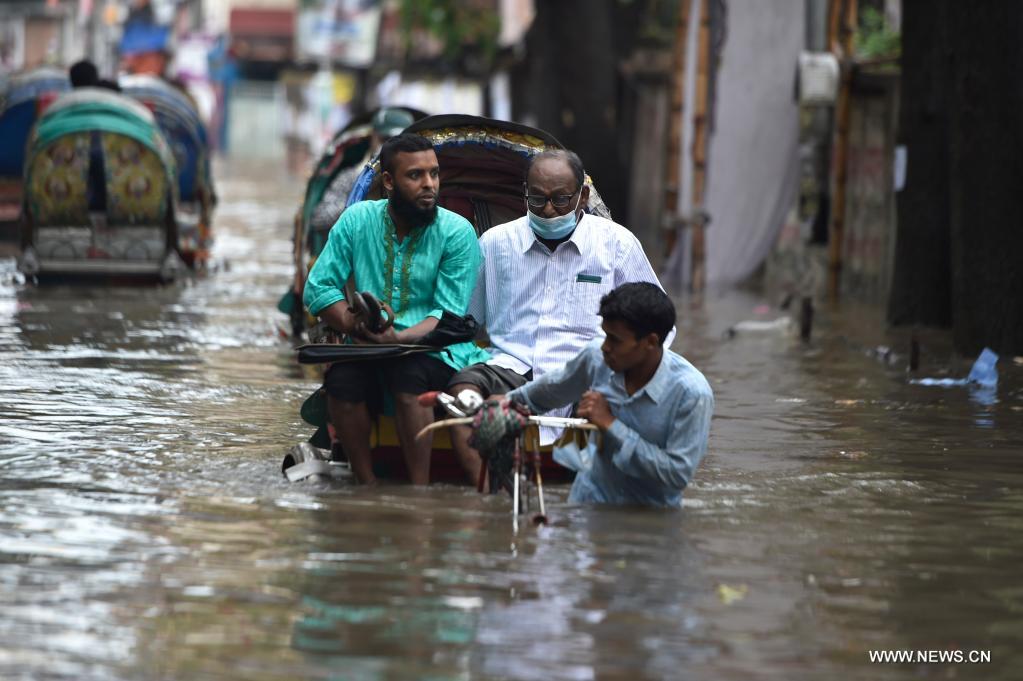 دكا أول يونيو 2021 (شينخوا) في الصورة الملتقطة أول يونيو 2021، عربات "الريكشا" تسير في شارع مليء بالمياه في منطقة منخفضة في دكا عاصمة بنغلاديش، حيث اجتاحت الأمطار الغزيرة دكا صباح اليوم (الثلاثاء)، وأغرقت المناطق المنخفضة وعطلت حركة المرور على الطرق.