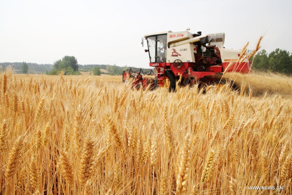 لينيي 2 يونيو 2021 (شينخوا) في الصورة الملتقطة أول يونيو 2021، مشهد لحصاد القمح في قرية في مدينة لينيي بمقاطعة شاندونغ شرقي الصين. وبدأ حصاد القمح المزروع على مساحة 3.99 مليون هكتار في المقاطعة من أول يونيو.
