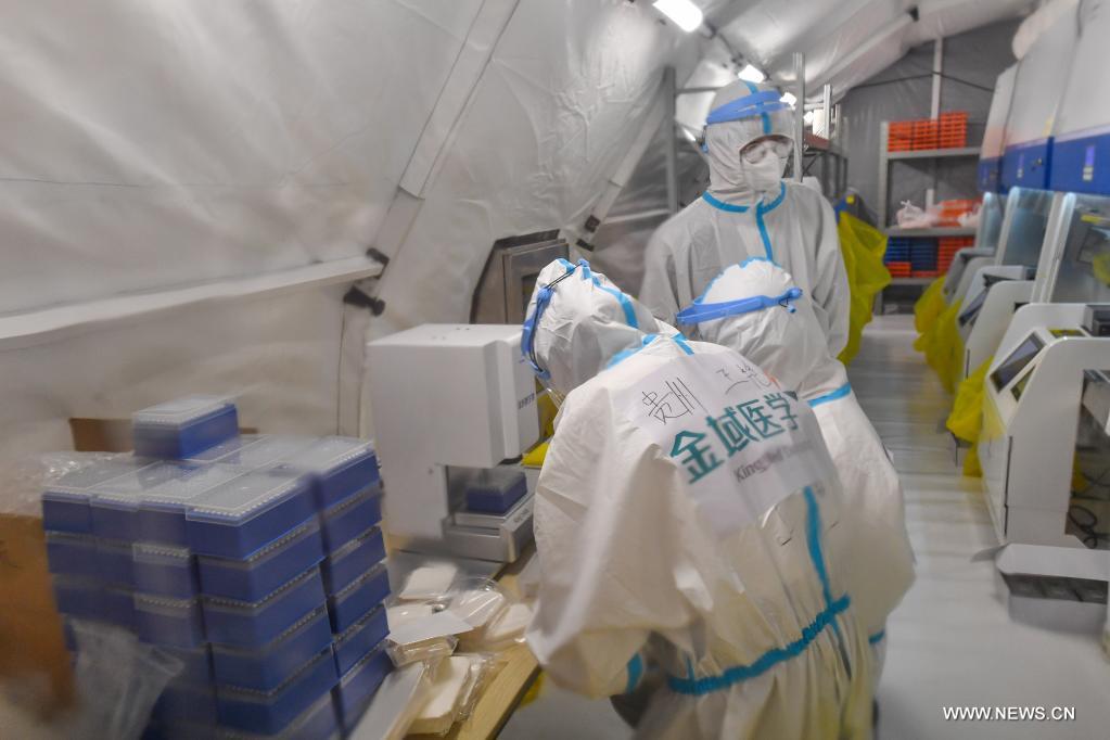 قوانغتشو 3 يونيو 2021 (شينخوا) في الصورة الملتقطة في اليوم الأول من يونيو 2021، موظفون يقومون بفحص الأدوات الخاصة باختبار الحمض النووي في مختبر مؤقت في استاد في قوانغتشو، حاضرة مقاطعة قوانغدونغ جنوبي الصين. وقد تمت إقامة أربعة مختبرات لاختبار الحمض النووي تغطى مساحة كل وحدة منها 210 أمتار مربعة، فى الصباح الباكر يوم 2 يونيو، وستدخل حيز الاستخدام بدءا من اليوم 3 يونيو. ويمكن للمختبرات اختبار أكثر من 120 ألف عينة يوميا، مما سيحسن بشكل كبير قدرة المدينة على الاختبار.