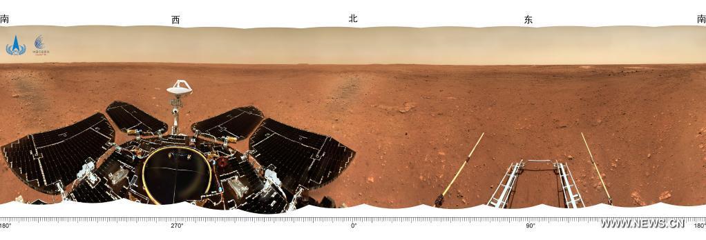 في الصورة التي تم الكشف عنها يوم 11 يونيو 2021 من قبل الهيئة الوطنية الصينية للفضاء، منظر بانورامي لموقع هبوط مركبة التجوال الصينية الأولى لاستكشاف المريخ "تشو رونغ".