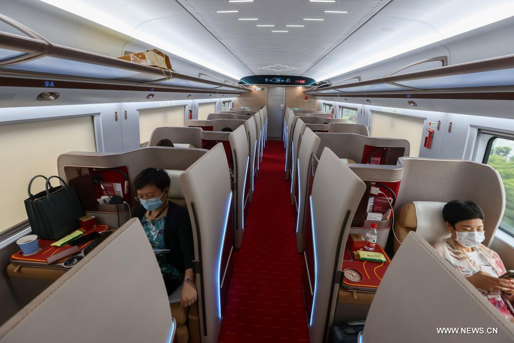 في الصورة الملتقطة يوم 25 يونيو 2021، ركاب على متن قطار "فوشينغ" الذكي فائق السرعة رقم جي 6، حيث دخلت قطارات "فوشينغ" الذكية فائقة السرعة طور التشغيل على بعض خطوط السكك الحديدية يوم الجمعة.