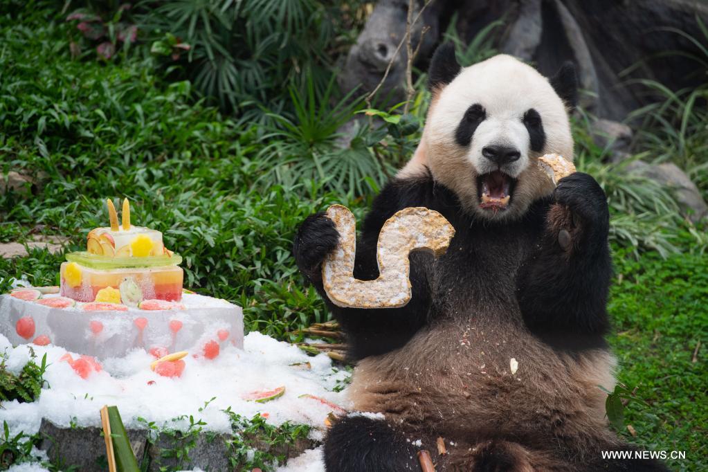 ماكاو 27 يونيو 2021 (شينخوا) في الصورة الملتقطة يوم 26 يونيو 2021، دب الباندا العملاقة كانغ كانغ يأكل أشياء خاصة بعيد الميلاد في منطقة ماكاو الادارية الخاصة. واحتفل توأم الباندا العملاقة جيانغ جيانغ وكانغ كانغ بعيد ميلادهما يوم السبت.