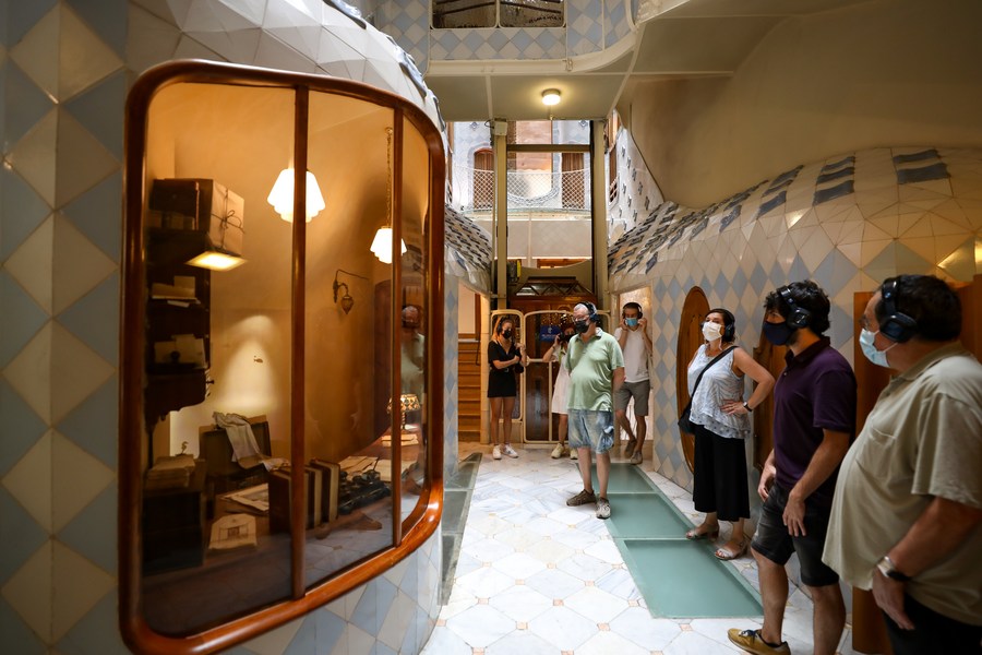 سائحون يزورون مبنى كازا باتلو، المبنى الشهير الذي صممه المهندس المعماري أنطوني غاودي، في برشلونة، إسبانيا، في 27 يونيو 2021. (شينخوا)