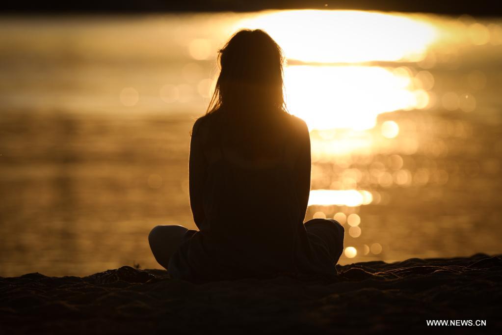 وارسو 7 يوليو 2021 (شينخوا) في الصورة الملتقطة يوم 6 يوليو 2021، امرأة تجلس على شاطئ بونياتوكا المطل على نهر فيستولا في العاصمة البولندية، وارسو.