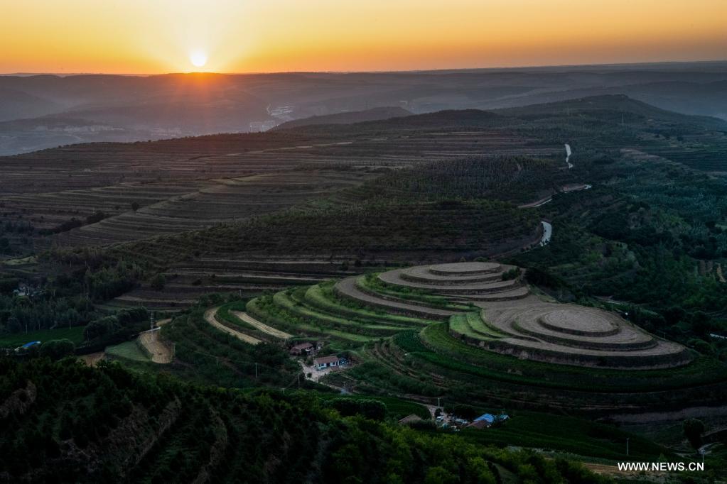 بنغيانغ 14 يوليو 2021 (شينخوا) في الصورة الجوية الملتقطة يوم 13 يوليو 2021، مدرجات زراعية في محافظة بنغيانغ بمنطقة نينغشيا ذاتية الحكم لقومية هوي شمال غربي الصين.