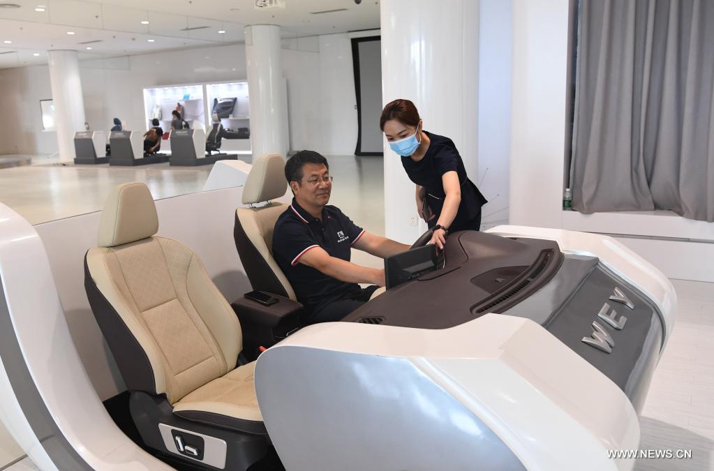باودينغ 19 يوليو 2021 (شينخوا) في الصورة الملتقطة يوم 15 يوليو 2021، زائر يجرب التكنولوجيا الذكية بمركز تكنولوجيا هافال لشركة جريت وول موتور في مدينة باودينغ بمقاطعة خبي شمالي الصين.