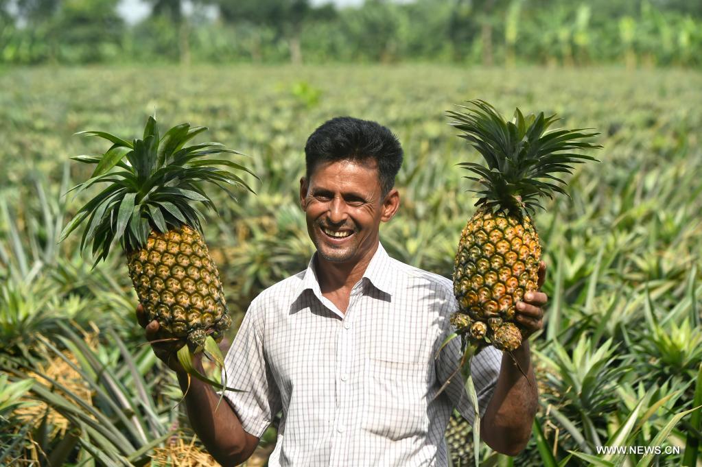 تانجيل 27 يوليو 2021 (شينخوا) في الصورة الملتقطة يوم 25 يوليو 2021، مزارع يعرض ثمار الأناناس في الحقل خلال موسم الحصاد في مدينة تانجيل في بنغلاديش.