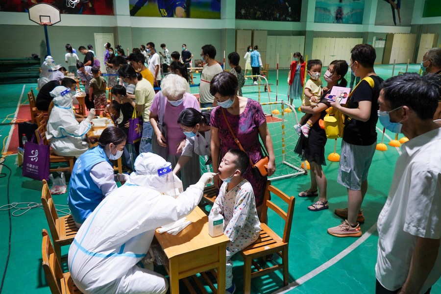 في الصورة الملتقطة يوم 21 يوليو 2021، عاملون طبيون يأخذون عينات مسحة الحلق من المواطنين لاختبارات الحمض النووي للكشف عن كوفيد-19 في موقع اختبار في مدينة نانجينغ، حاضرة مقاطعة جيانغسو بشرقي الصين. (شينخوا)