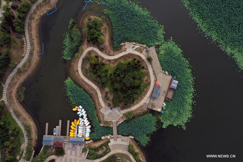 خجيان 14 أغسطس 2021 (شينخوا) في الصورة الجوية الملتقطة يوم 11 أغسطس، حديقة في مدينة خجيان بمقاطعة خبي شمالي الصين. خلال السنوات القليلة الماضية، تم إنشاء ما يزيد على 20 حديقة في المدينة في إطار التنمية الإيكولوجية.