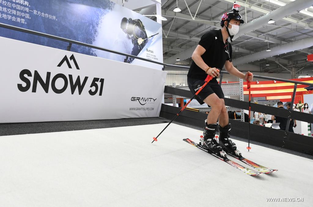 بكين 5 سبتمبر 2021 (شينخوا) في الصورة الملتقطة يوم 3 سبتمبر 2021، أحد العارضين يعرض جهاز محاكاة التزلج خلال معرض الصين الدولي لتجارة الخدمات لعام 2021 في العاصمة الصينية بكين.