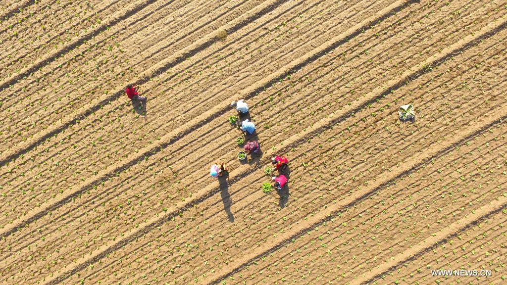 لياوتشنغ (شاندونغ) 8 سبتمبر 2021 (شينخوا) في الصورة الملتقطة يوم 7 سبتمبر 2021، فلاحون يقومون بزراعة الكرنب في قرية بمدينة لياوتشنغ في مقاطعة شاندونغ بشرقي الصين. وصادف اليوم ذاته يوم الندى الأبيض، وهو أحد الأيام الشمسية الاربعة والعشرون، وفقا لتقويم يوضح أعمال الزراعة.