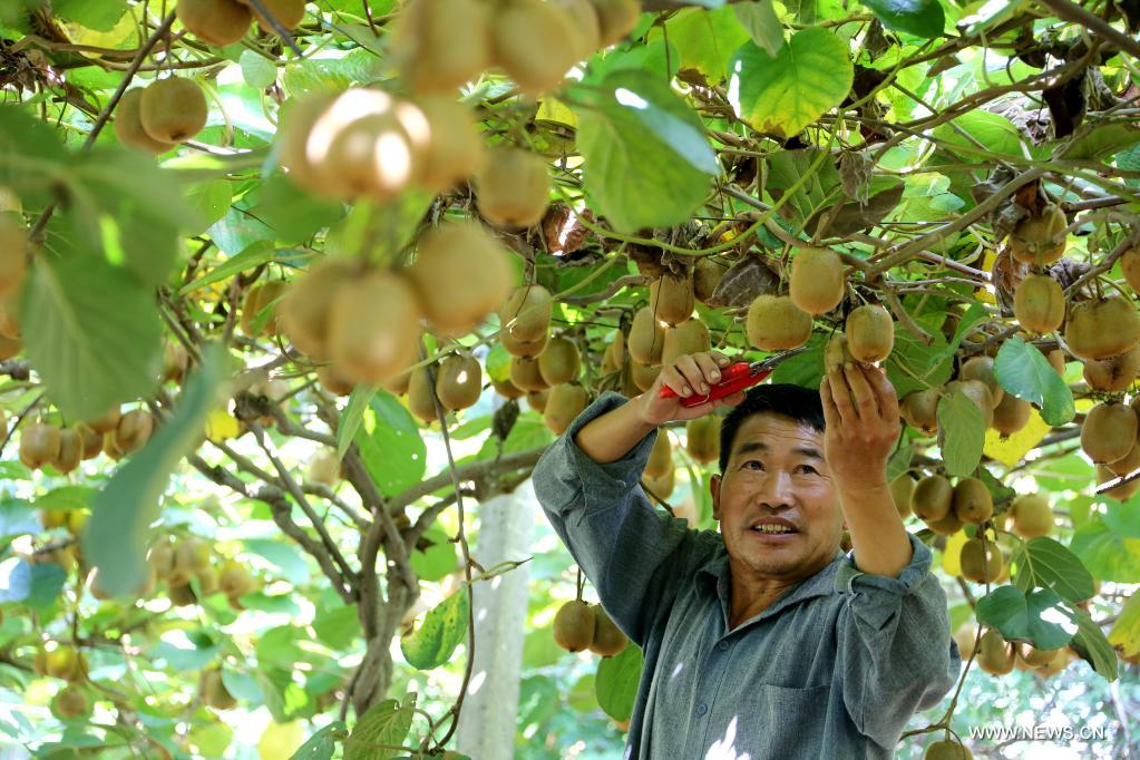 تساوتشوانغ (شاندونغ) 9 سبتمبر 2021 (شينخوا) في الصورة الملتقطة يوم 7 سبتمبر 2021، فلاح يقوم بحصاد فاكهة الكيوي في قرية بمدينة تساوتشوانغ في مقاطعة شاندونغ بشرقي الصين. وصادف اليوم ذاته يوم الندى الأبيض، وهو أحد الأيام الشمسية الاربعة والعشرون، وفقا لتقويم يوضح أعمال الزراعة.
