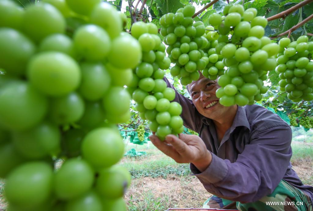 يويبينغ (قويتشو) 9 سبتمبر 2021 (شينخوا) في الصورة الملتقطة يوم 7 سبتمبر 2021، فلاح يقوم بحصاد العنب في قرية بمدينة تونغرن في مقاطعة قويتشو بجنوب غربي الصين. وصادف اليوم ذاته يوم الندى الأبيض، وهو أحد الأيام الشمسية الاربعة والعشرون، وفقا لتقويم يوضح أعمال الزراعة.