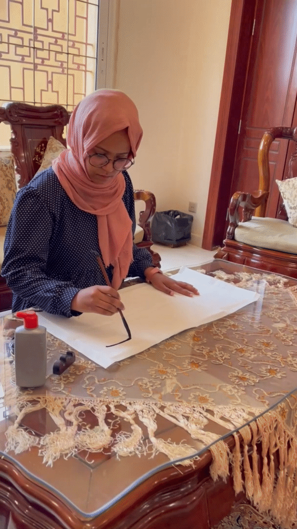 وحاولت عرض فنها في الخط الصيني في مسابقة "جسر اللغة الصينية".