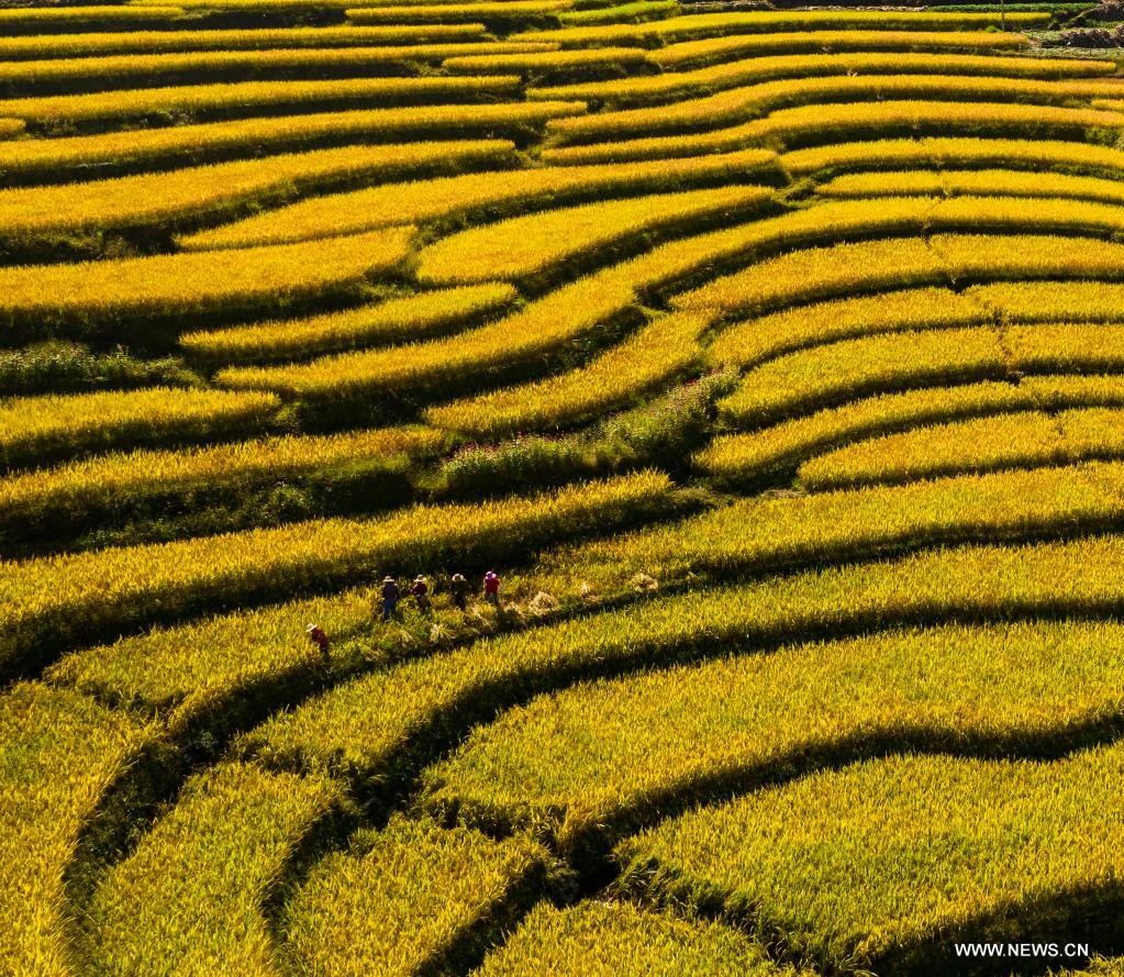ييتشانغ (هوبي) 23 سبتمبر 2021 (شينخوا) في الصورة الملتقطة يوم 21 سبتمبر 2021، مشهد حصاد الأرز في محافظة تسيقوي في مقاطعة هوبي بوسط الصين.
