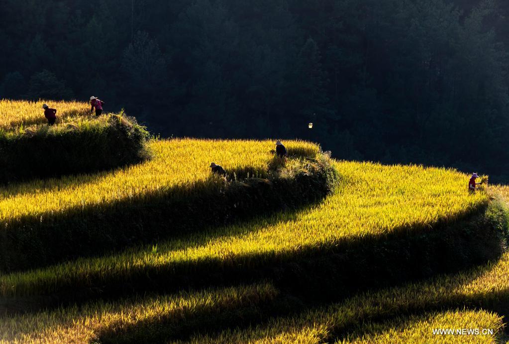 ييتشانغ (هوبي) 23 سبتمبر 2021 (شينخوا) في الصورة الملتقطة يوم 21 سبتمبر 2021، مشهد حصاد الأرز في محافظة تسيقوي في مقاطعة هوبي بوسط الصين.
