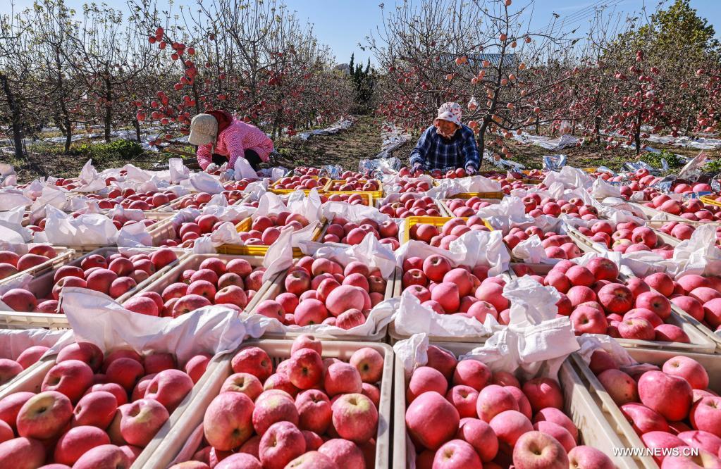 رونغتشنغ، شاندونغ 22 أكتوبر 2021 (شينخوا) في الصورة الملتقطة يوم 20 أكتوبر 2021، مزارعون يقومون بتعبئة التفاح في بستان للتفاح في مدينة رونغتشنغ بمقاطعة شاندونغ بشرقي الصين، مع حلول موسم جمع التفاح.