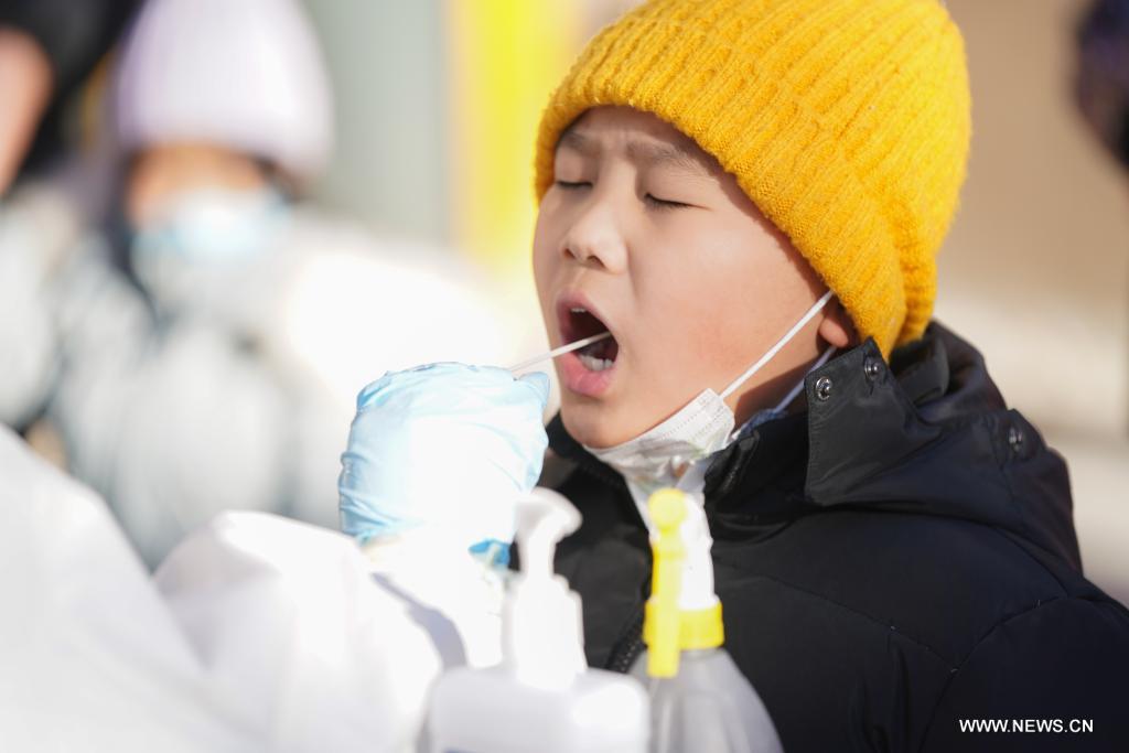 هيخه أول نوفمبر 2021 (شينخوا) في الصورة الملتقطة يوم 31 أكتوبر 2021، طفل يخضع لاختبار الحمض النووي في أحد مواقع الاختبار في مدينة هيخه بمقاطعة هيلونغجيانغ شمال شرقي الصين.