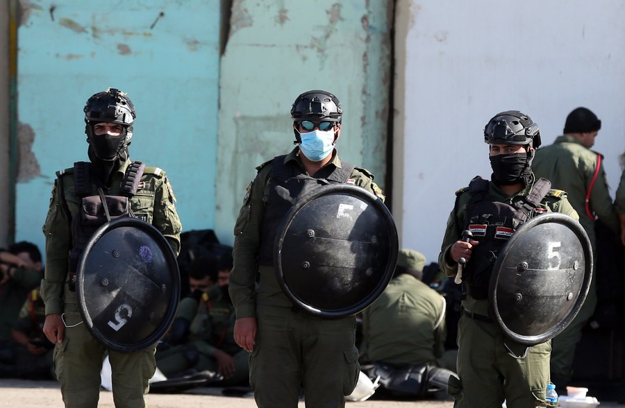 في الصورة الملتقطة يوم 7 نوفمبر 2021، أعضاء قوات مكافحة الشغب يقفون بالقرب من المنطقة الخضراء بعد محاولة الاغتيال الفاشلة لرئيس الوزراء العراقي مصطفى الكاظمي في العاصمة العراقية، بغداد. (شينخوا)