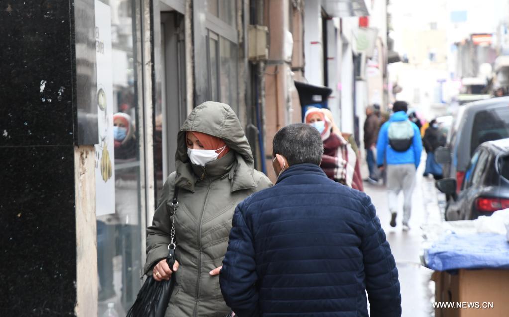 تونس 5 ديسمبر 2021 (شينخوا) في الصورة الملتقطة يوم 4 ديسمبر 2021، أشخاص يرتدون كمامات ويسيرون في شارع بالعاصمة التونسية، تونس. أصيب شاب من دولة في إفريقيا جنوب الصحراء، 23 عاما، بمتغير "أوميكرون" لفيروس كورونا الجديد في تونس، حسبما ذكر علي مرابط وزير الصحة التونسي يوم الجمعة.