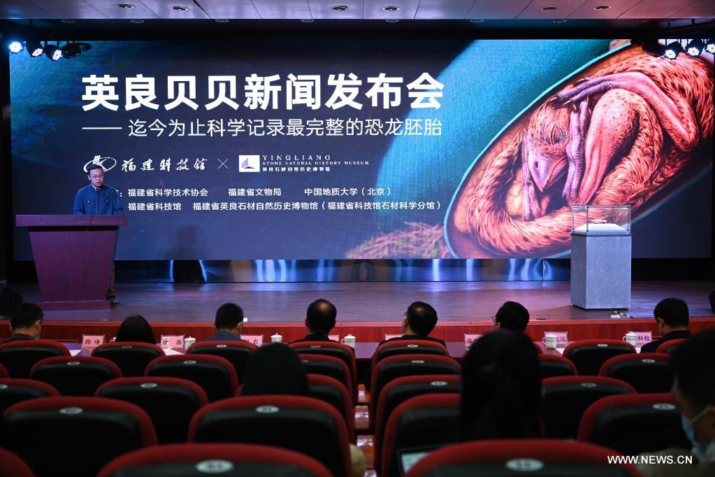 فوتشو 23 ديسمبر 2021 (شينخوا) في الصورة الملتقطة يوم 22 ديسمبر 2021، مشهد لمؤتمر صحفي حول الدراسة بشأن جنين الديناصور المتحجر، والذي أقيم في متحف التكنولوجيا بمقاطعة فوجيان بجنوب شرقي الصين.