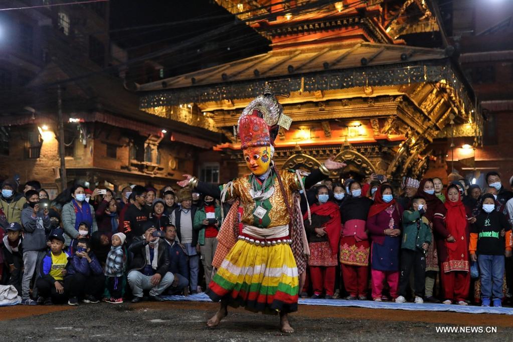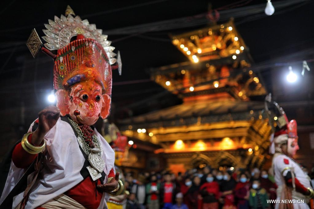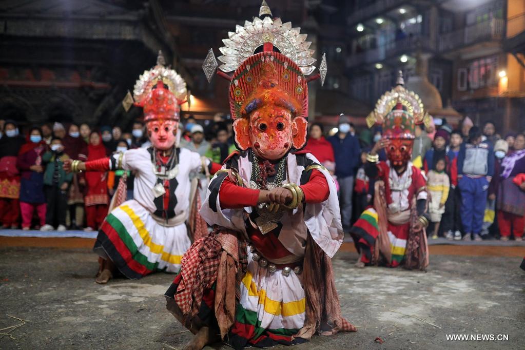 باكتابور 26 ديسمبر 2021 (شينخوا) في الصورة الملتقطة يوم 25 ديسمبر 2021، راقصون مقنعون يؤدون عرضا خلال مهرجان نافادورجا في باكتابور بنيبال.