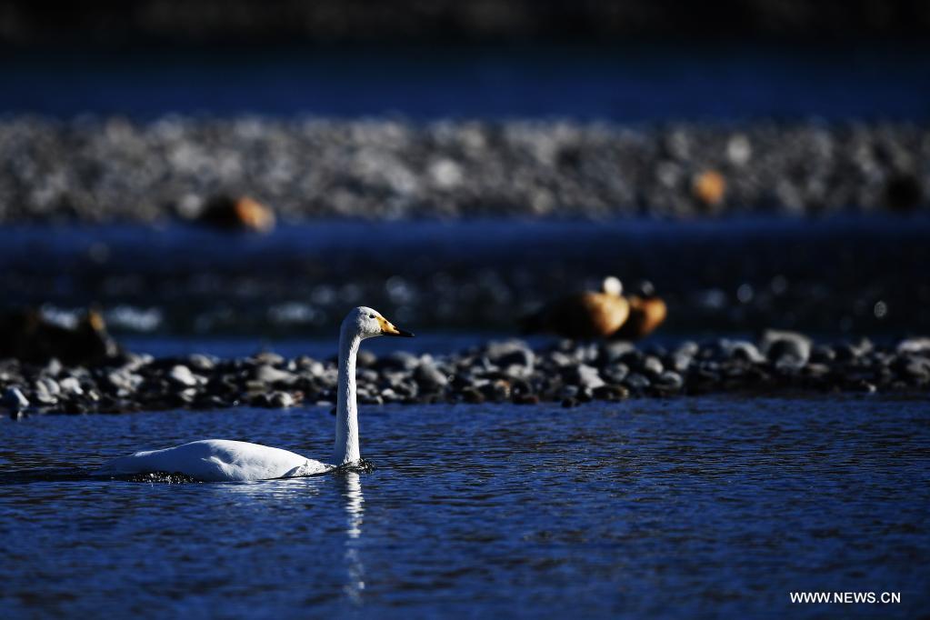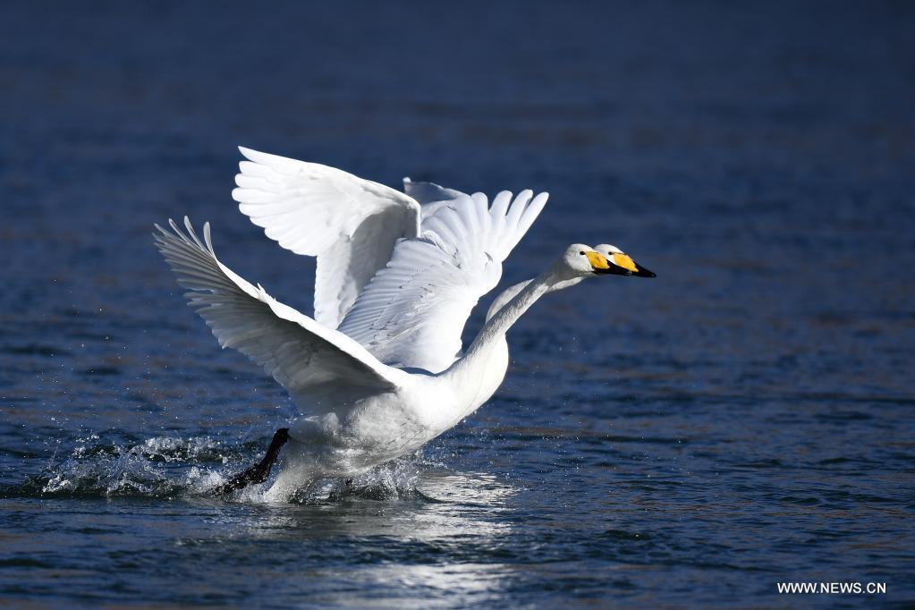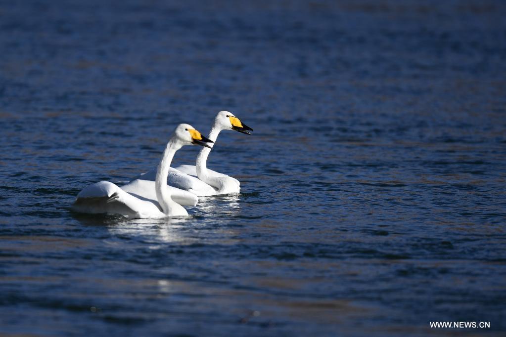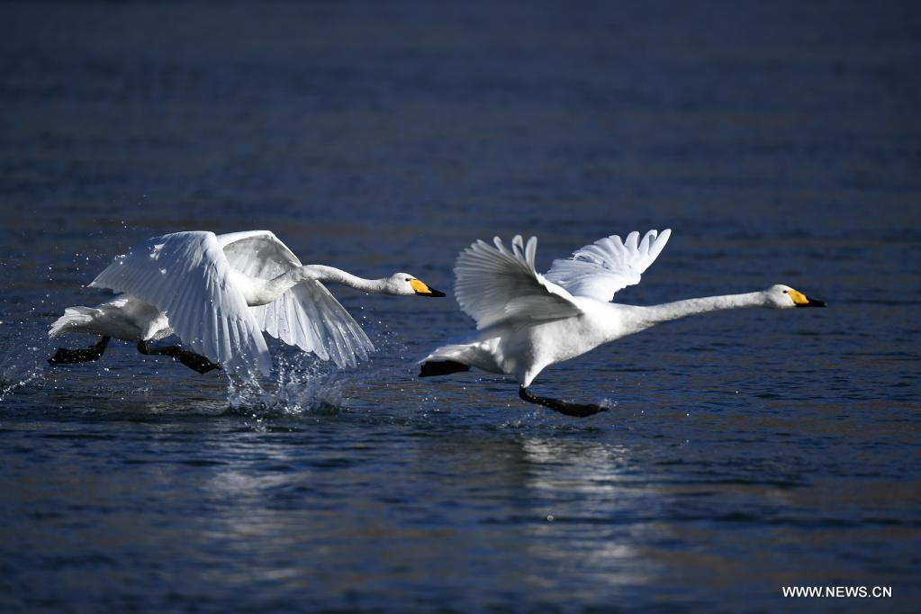 قويده (تشينغهاي) 27 ديسمبر 2021 (شينخوا) في الصورة الملتقطة يوم 24 ديسمبر 2021، طيور البجع في الأراضي الرطبة للنهر الأصفر في محافظة قويده بمقاطعة تشينغهاي شمال غربي الصين. هاجرت المئات من طيور البجع حديثا إلى قويده لقضاء فصل الشتاء.