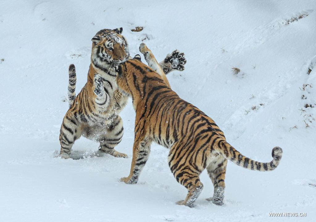 رونغتشنغ، شاندونغ 28 ديسمبر 2021 (شينخوا) في الصورة الملتقطة يوم 26 ديسمبر 2021، نمران سيبيريان يلعبان ويمرحان وسط الثلوج في حديقة شندياوشان للحيوانات البرية بمدينة رونغتشنغ في مقاطعة شاندونغ بشرقي الصين.