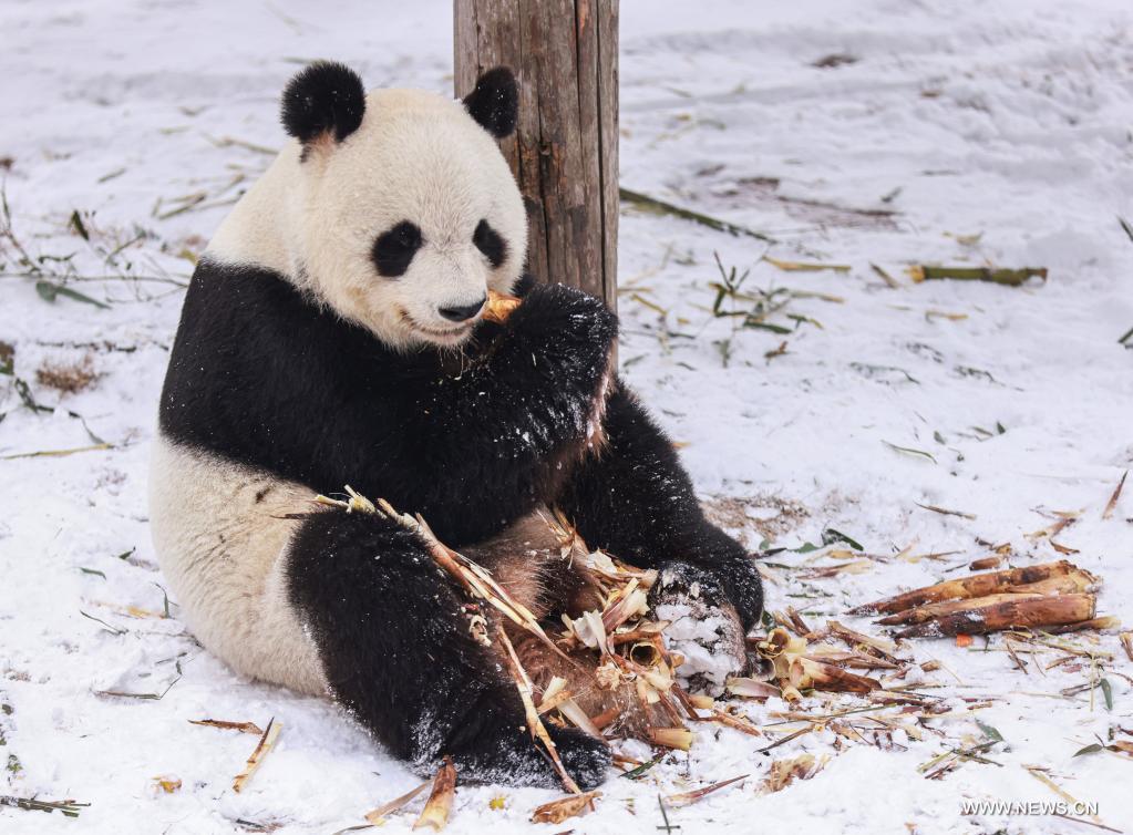 رونغتشنغ، شاندونغ 28 ديسمبر 2021 (شينخوا) في الصورة الملتقطة يوم 26 ديسمبر 2021، حيوان باندا عملاق يتناول براعم الخيزران وسط الثلوج في حديقة شندياوشان للحيوانات البرية بمدينة رونغتشنغ في مقاطعة شاندونغ بشرقي الصين.