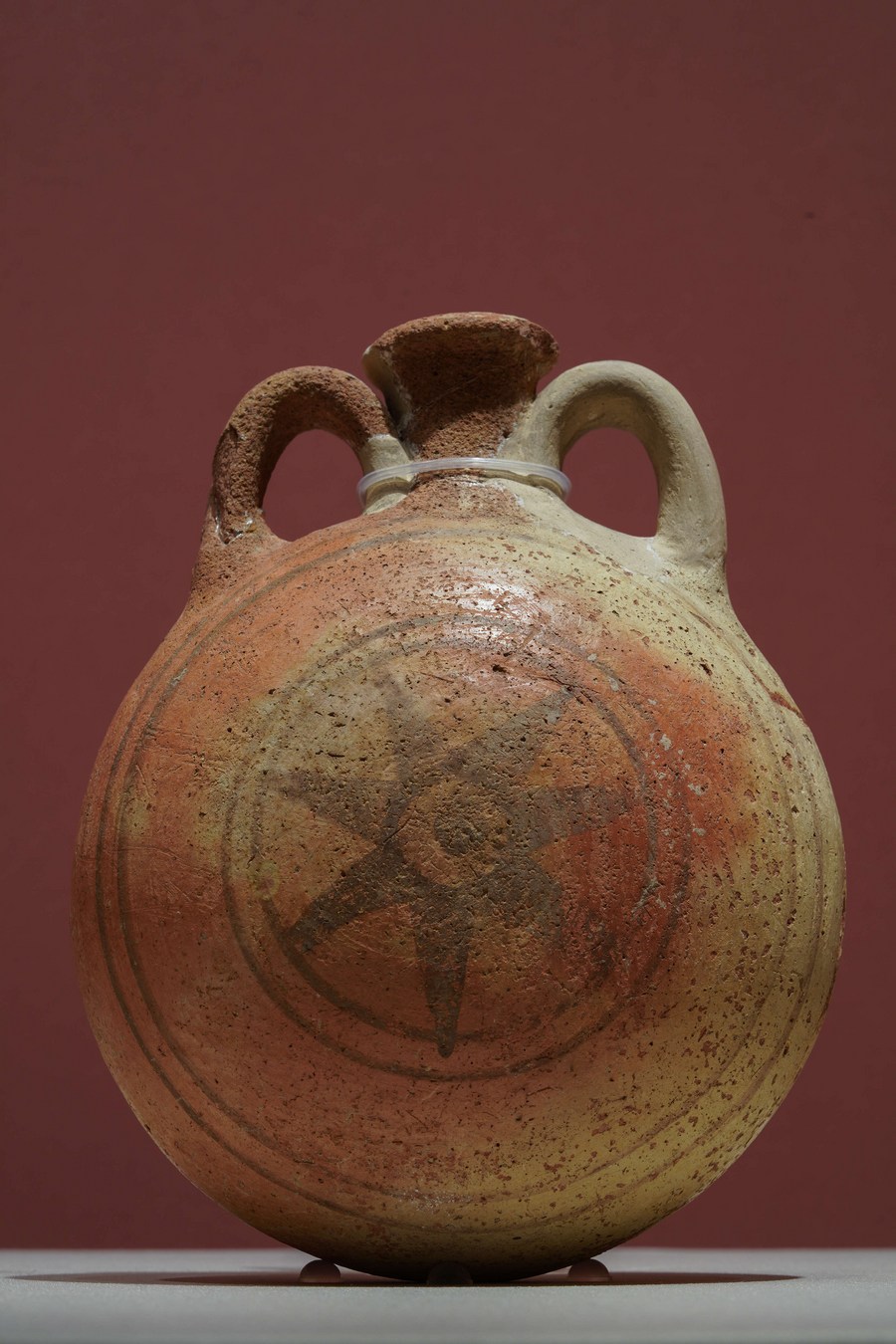 إناء فخاري مطلي بنمط الشمس. (صورة مقدمة من متحف موقع "جينشا" الأثري / شينخوا)