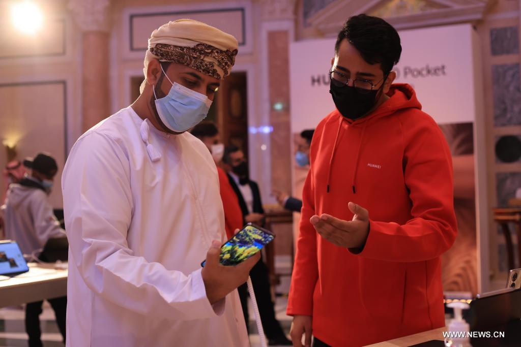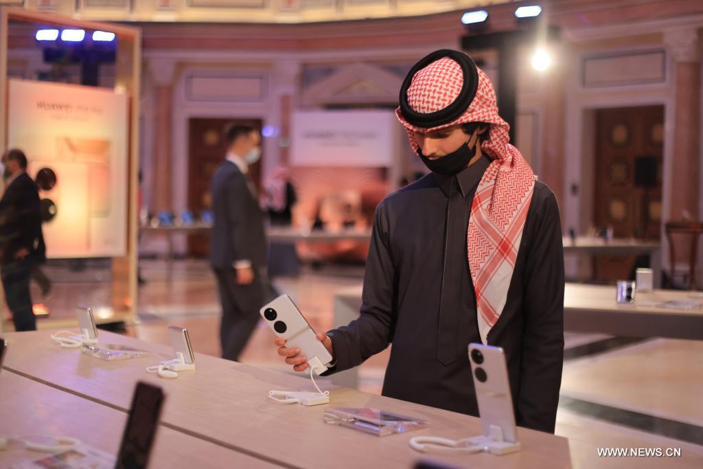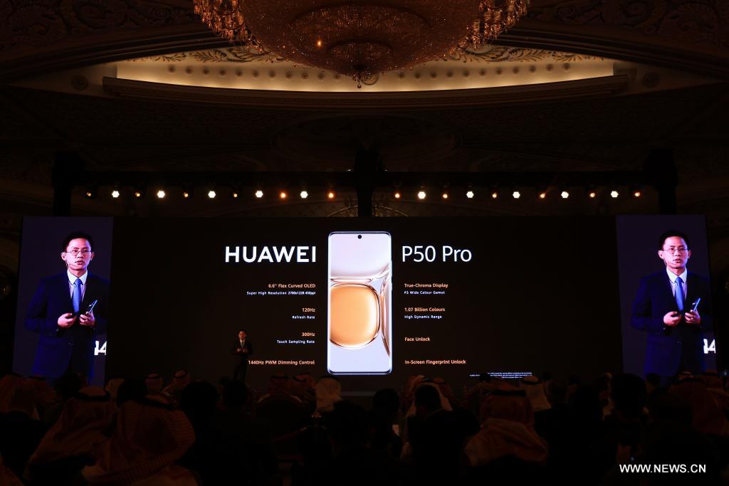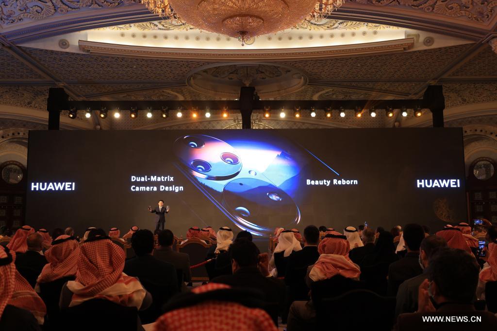 الرياض 28 يناير 2022 (شينخوا) في الصورة الملتقطة يوم 26 يناير 2022، مشهد لفعالية إطلاق سلسلة الهاتف المحمول (هواوي بي 50) في قاعة المؤتمرات بفندق ريتز كارلتون في الرياض بالمملكة العربية السعودية.