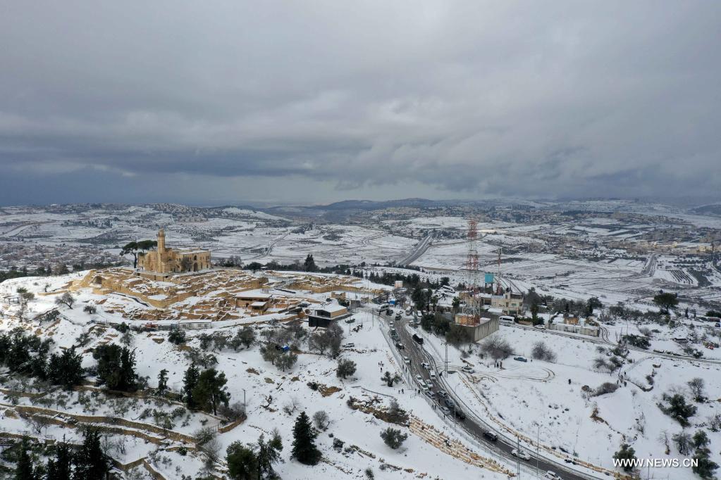القدس 28 يناير 2022 (شينخوا) في الصورة الجوية الملتقطة يوم 27 يناير 2022، منظر القدس بعد تساقط الثلوج.