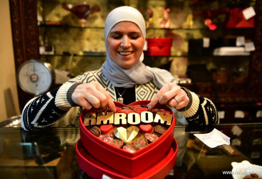 دمشق 13 فبراير 2022 (شينخوا) في الصورة الملتقطة يوم 12 فبراير 2022، هدية على شكل قلب من الشوكولاتة تم تجهيزها لعيد الحب القادم في العاصمة السورية، دمشق.
