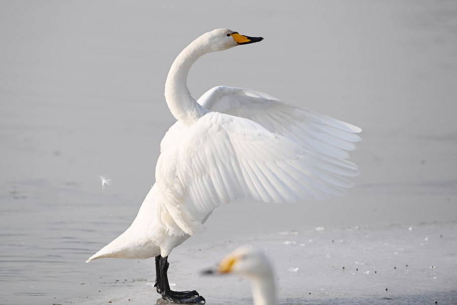 في الصورة الملتقطة يوم 6 يناير 2022، بجعة هوبر عند ملتقى نهر هوانغشوي والنهر الأصفر في مدينة لانتشو، حاضرة مقاطعة قانسو شمال غربي الصين. (شينخوا)