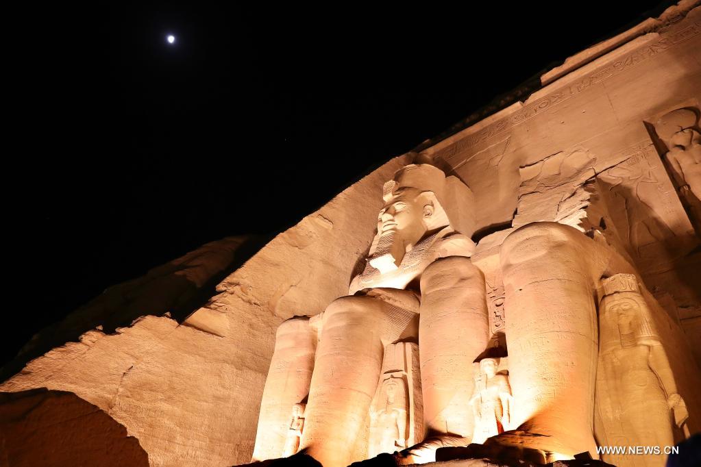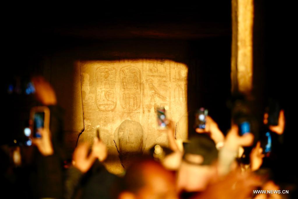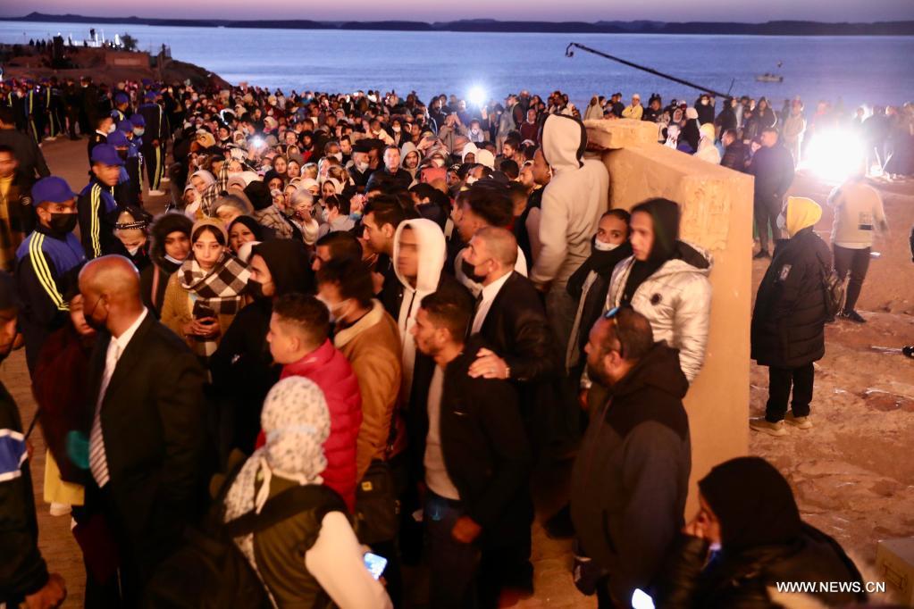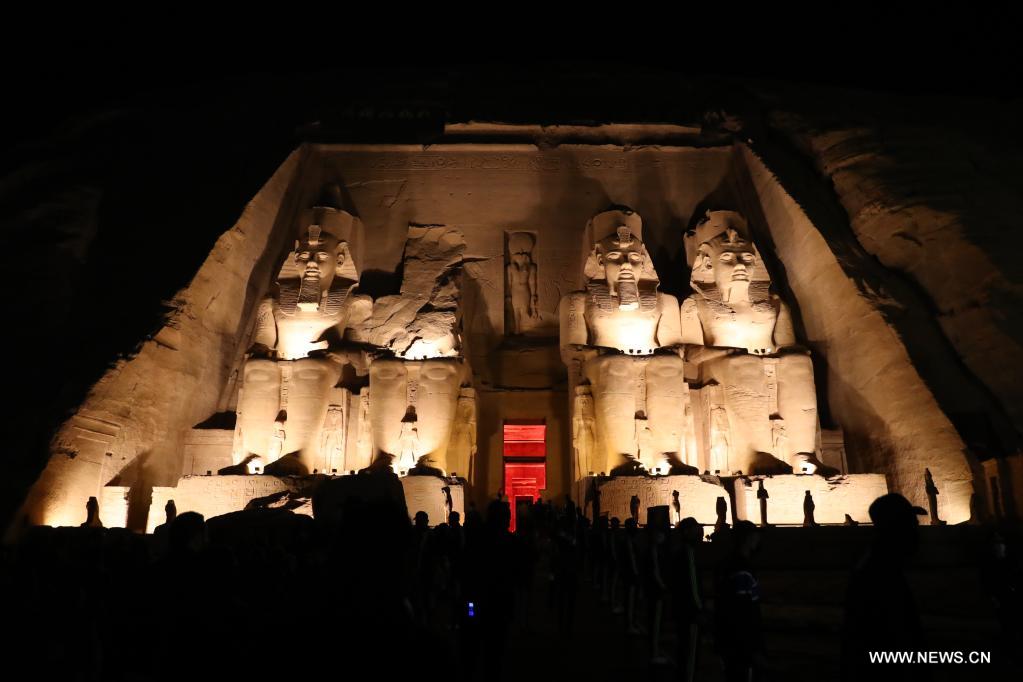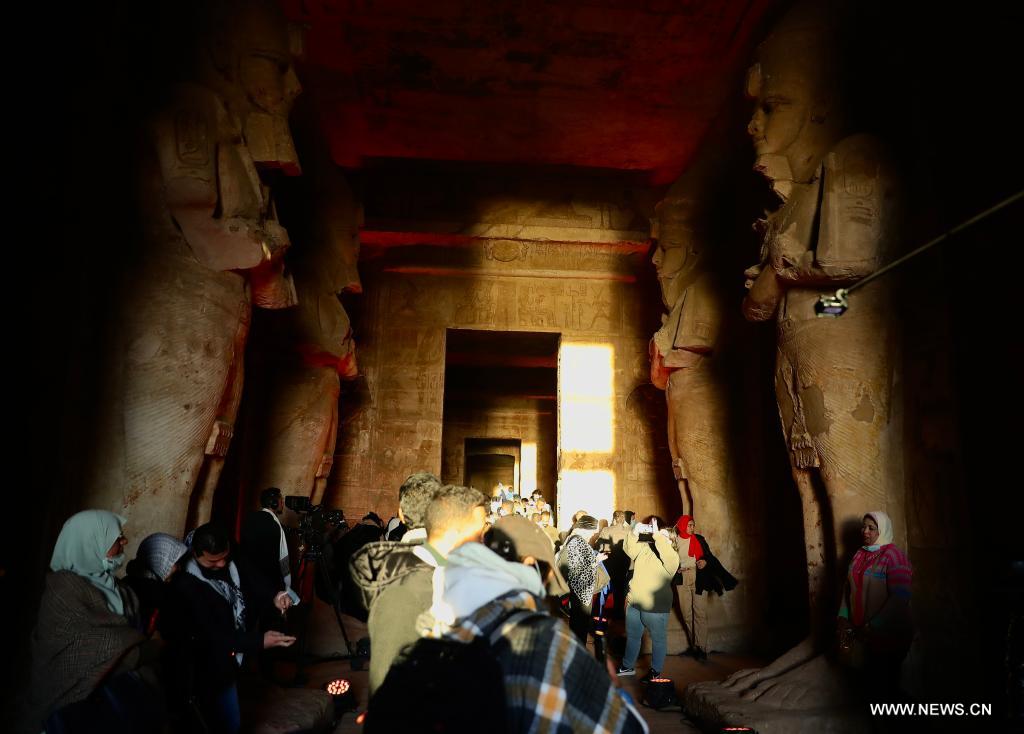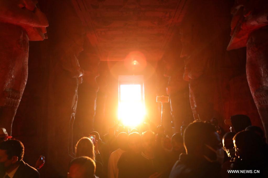 أسوان 22 فبراير 2022 (شينخوا) في الصورة الملتقطة يوم 22 فبراير 2022، سائحون يزورون معبد أبو سمبل الكبير خلال مهرجان الشمس في أسوان بمصر. خلال مهرجان الشمس، تتجمع الجماهير قبل شروق الشمس لمشاهدة ضوء الشمس وهو يضيء التماثيل المقامة في الجزء الداخلي الأعمق بالمعبد، ومنها تماثيل الملك رمسيس الثاني. وتظل تلك التماثيل في الظلام داخل معبد أبو سمبل الكبير طوال العام ما عدا يومي 22 فبراير و22 أكتوبر، عندما تسقط أشعة الشمس على التماثيل إحياء لذكرى تتويج الملك وعيد ميلاده.