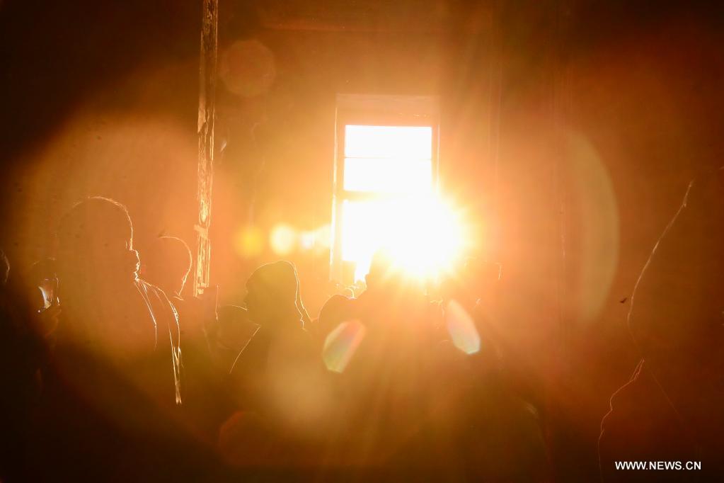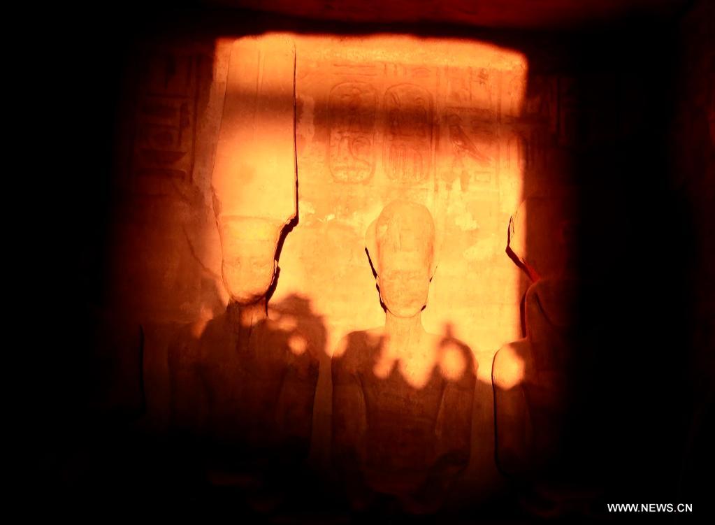 أسوان 22 فبراير 2022 (شينخوا) في الصورة الملتقطة يوم 22 فبراير 2022، شعاع من ضوء الشمس ينفذ إلى داخل معبد أبو سمبل الكبير خلال مهرجان الشمس في أسوان بمصر. خلال مهرجان الشمس، تتجمع الجماهير قبل شروق الشمس لمشاهدة ضوء الشمس وهو يضيء التماثيل المقامة في الجزء الداخلي الأعمق بالمعبد، ومنها تماثيل الملك رمسيس الثاني. وتظل تلك التماثيل في الظلام داخل معبد أبو سمبل الكبير طوال العام ما عدا يومي 22 فبراير و22 أكتوبر، عندما تسقط أشعة الشمس على التماثيل إحياء لذكرى تتويج الملك وعيد ميلاده.