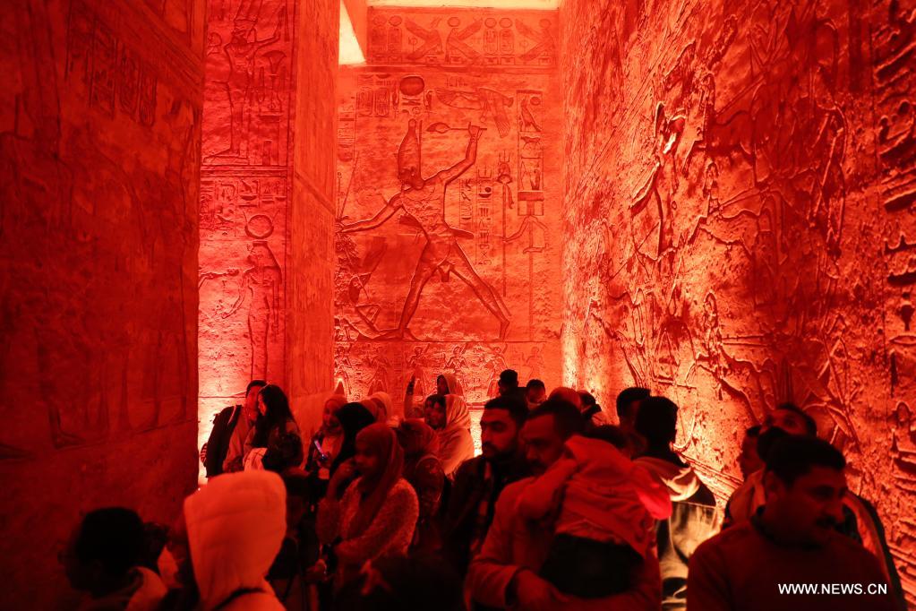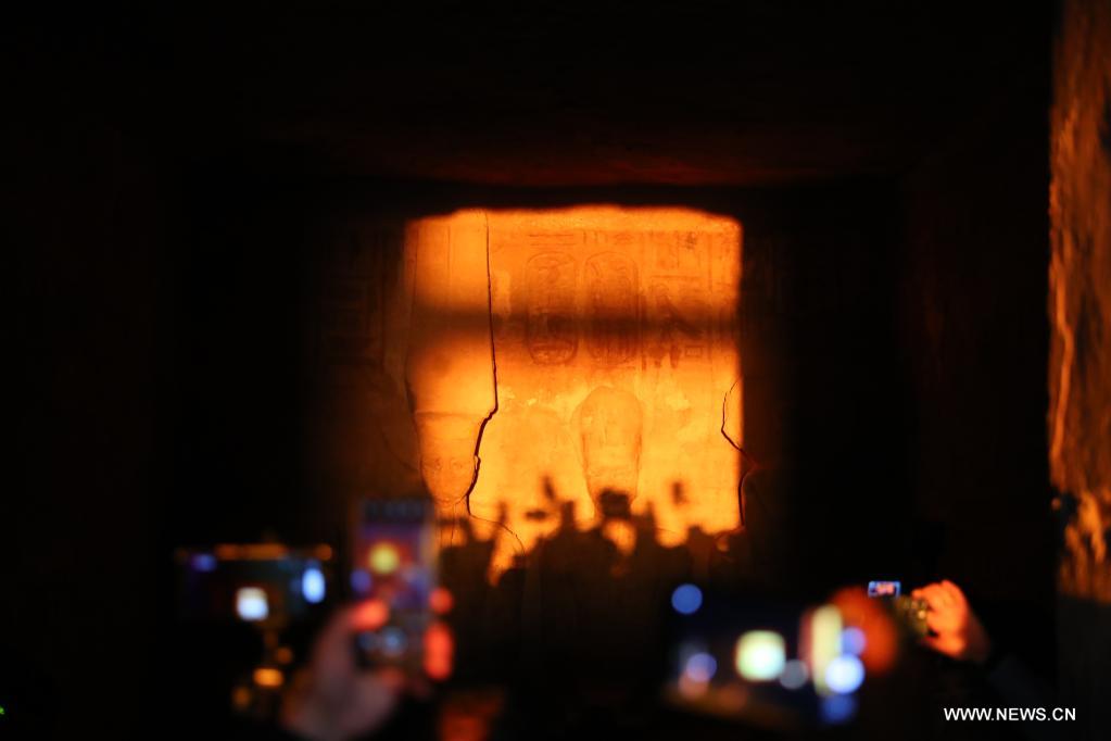 أسوان 22 فبراير 2022 (شينخوا) في الصورة الملتقطة يوم 22 فبراير 2022، الضوء يغمر الجزء الداخلي من معبد أبو سمبل الكبير خلال مهرجان الشمس في أسوان بمصر. خلال مهرجان الشمس، تتجمع الجماهير قبل شروق الشمس لمشاهدة ضوء الشمس وهو يضيء التماثيل المقامة في الجزء الداخلي الأعمق بالمعبد، ومنها تماثيل الملك رمسيس الثاني. وتظل تلك التماثيل في الظلام داخل معبد أبو سمبل الكبير طوال العام ما عدا يومي 22 فبراير و22 أكتوبر، عندما تسقط أشعة الشمس على التماثيل إحياء لذكرى تتويج الملك وعيد ميلاده.