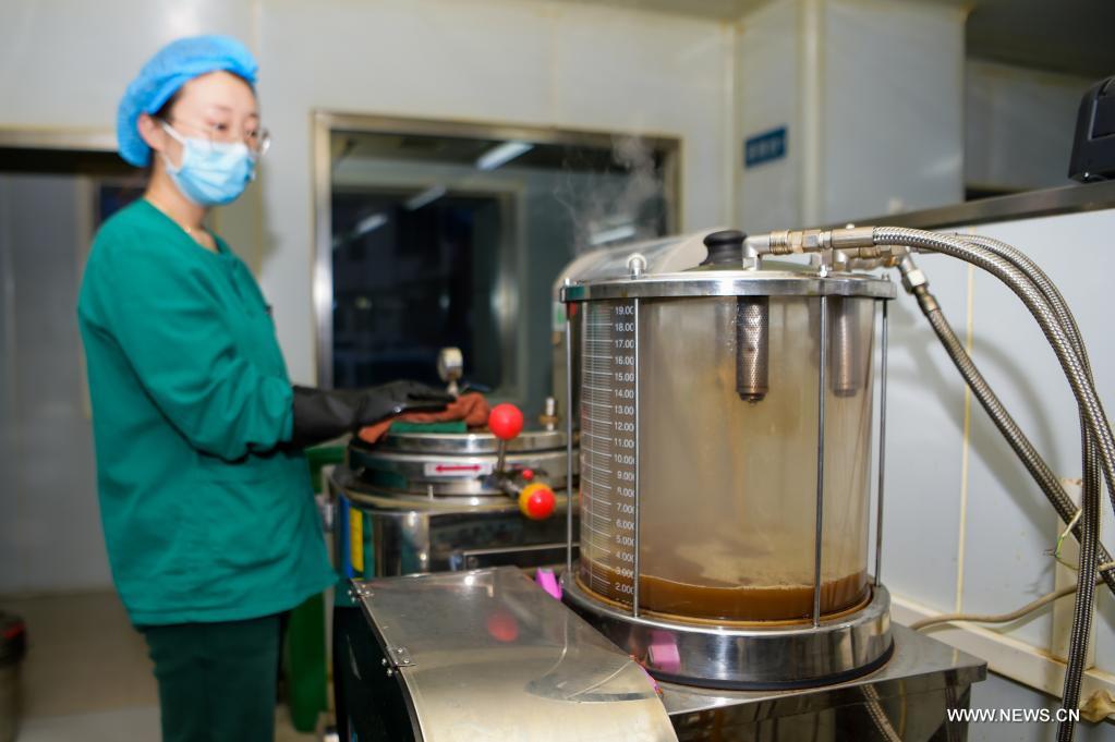 هوهوت 26 فبراير 2022 (شينخوا) في الصورة الملتقطة يوم 25 فبراير 2022، دواء صيني في آلة ديكوتيون في مستشفى الطب الصيني التقليدي لمنطقة منغوليا الداخلية ذاتية الحكم.