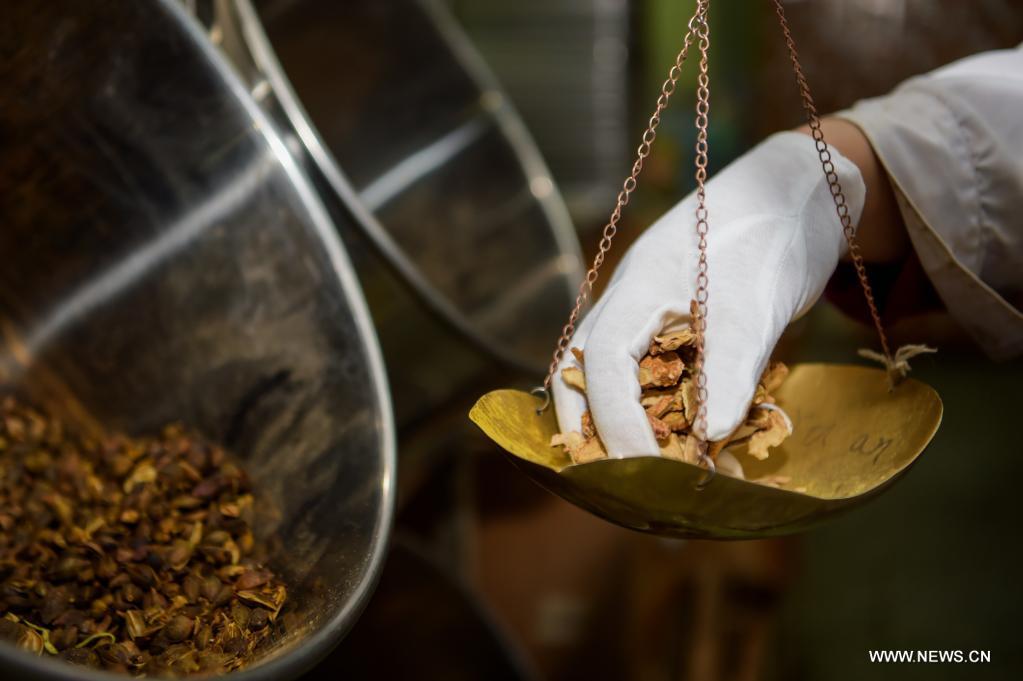هوهوت 26 فبراير 2022 (شينخوا) في الصورة الملتقطة يوم 25 فبراير 2022، صيدلي يقوم بتحضير علاج صيني تقليدي حسب الوصفة الطبية في مستشفى الطب الصيني التقليدي لمنطقة منغوليا الداخلية ذاتية الحكم.