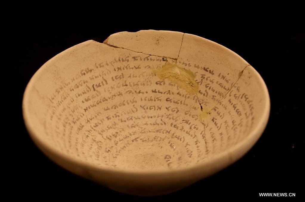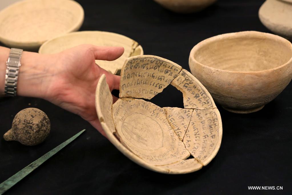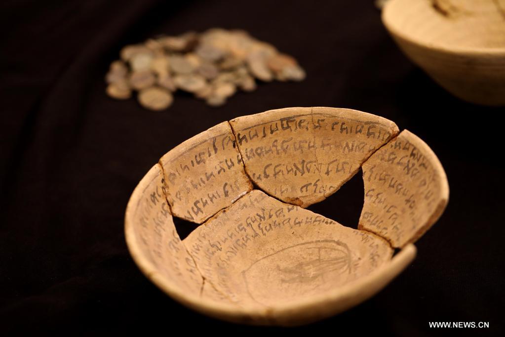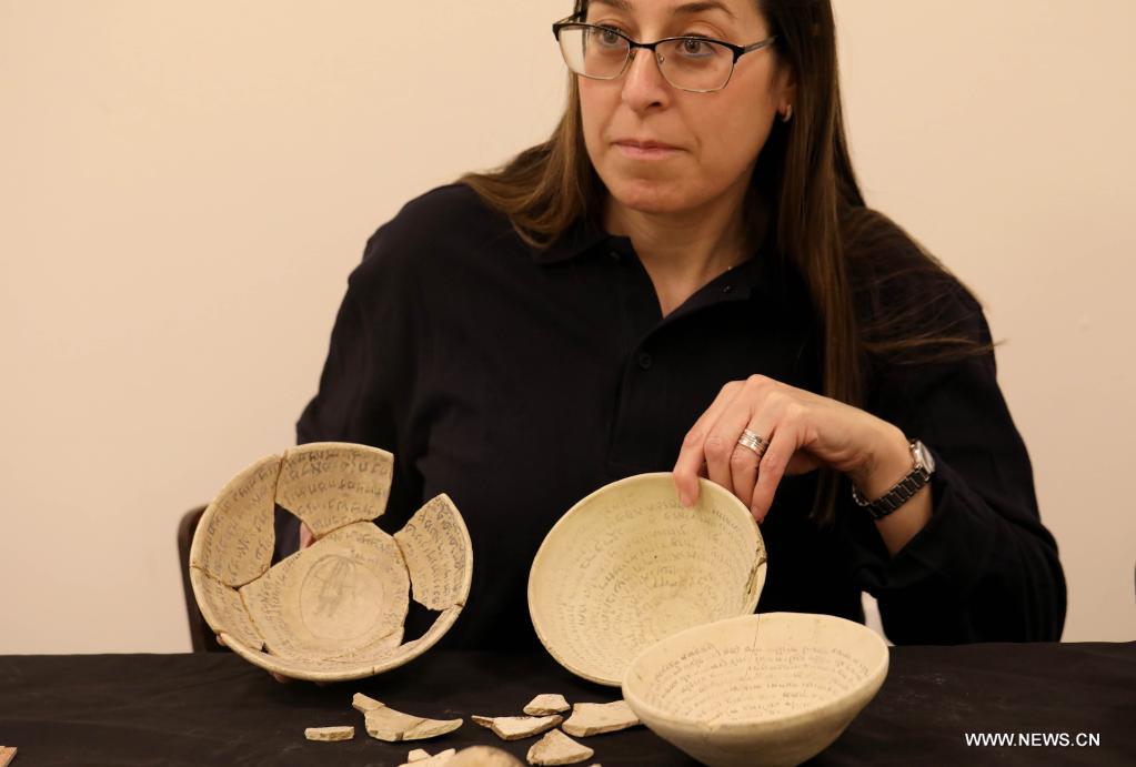 القدس 8 مارس 2022 (شينخوا) في الصورة الملتطقة يوم 7 مارس 2022، مجموعة من الأواني السحرية القديمة في القدس. اكتشفت الأواني السحرية القديمة، المنقوش عليها نصوص تعويذات وطلاسم باللغتين العبرية والآرامية البابلية، ضمن قطع أثرية في القدس، وفقا لما قالت هيئة الآثار الإسرائيلية اليوم (الاثنين).