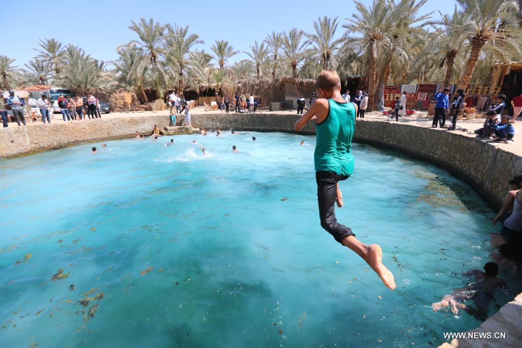 سيوة 28 مارس 2022 (شينخوا) في الصورة الملتقطة يوم 26 مارس 2022، شاب يغطس في حمام كليوباترا في واحة سيوة بمحافظة مطروح في مصر. تقع واحة سيوة في الصحراء الغربية في مصر ويوجد بها نحو 2000 من الينابيع الطبيعية الساخنة التي يحب الأشخاص المحليون الاستحمام فيها.