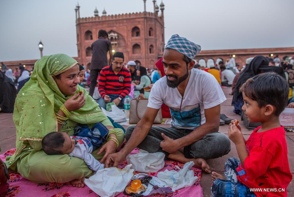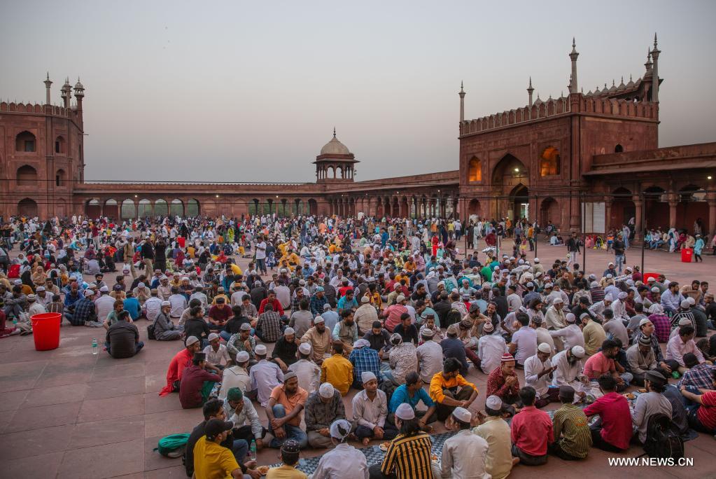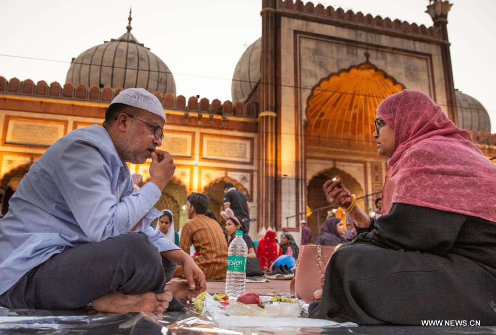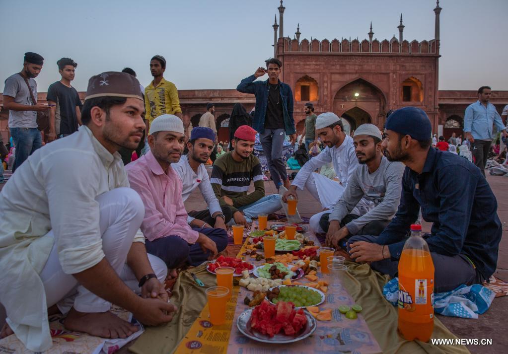 نيودلهي 4 أبريل 2022 (شينخوا) في الصورة الملتقطة يوم 3 أبريل 2022، مسلمون ينتظرون الإفطار بعد الصيام في شهر رمضان المبارك في المسجد الجامع في نيودلهي بالهند.