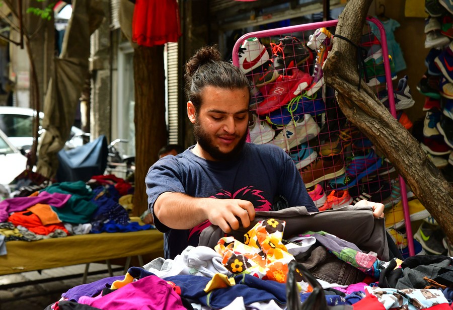دمشق 19 أبريل 2022 (شينخوا) تلقى الملابس المستعملة إقبالا في سوريا حيث أصبحت أسعار الملابس الجديدة بعيدة عن متناول العديد من المستهلكين وسط أزمة اقتصادية نتجت عن حرب طويلة الأمد فضلا عن العقوبات الأمريكية والغربية.